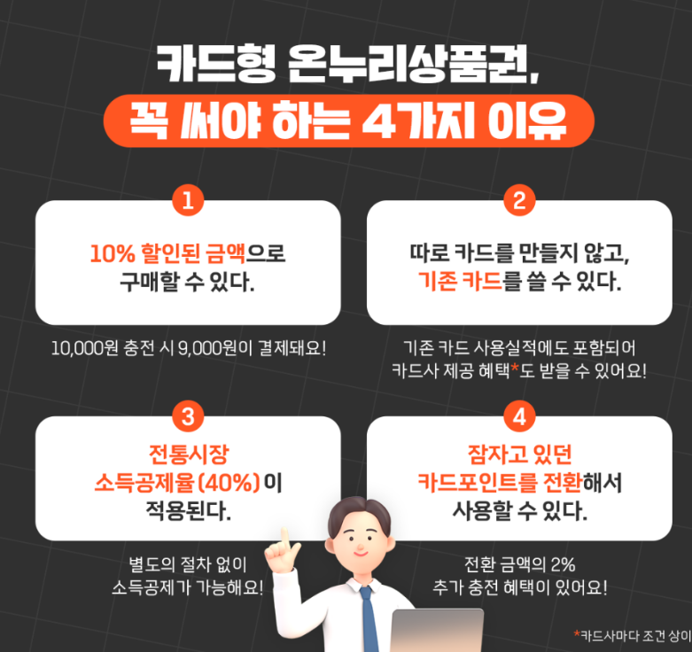 | 세금 혜택 | 전통시장 사용 시 소득공제 40% 적용 |