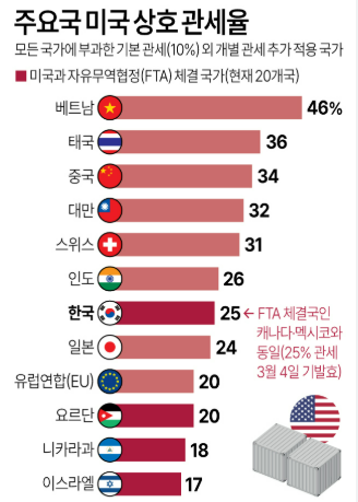 한국, 중국, 유럽 등 여러 나라에 25~26%의 상호관세를 부과하겠다고 선언했습니다.
