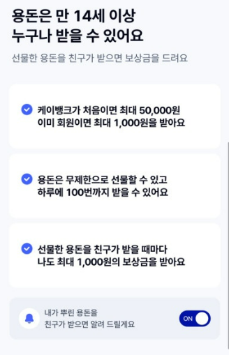 - 케이뱅크 앱에서 ‘용돈 뿌리기’ 링크를 생성해 친구에게 전송